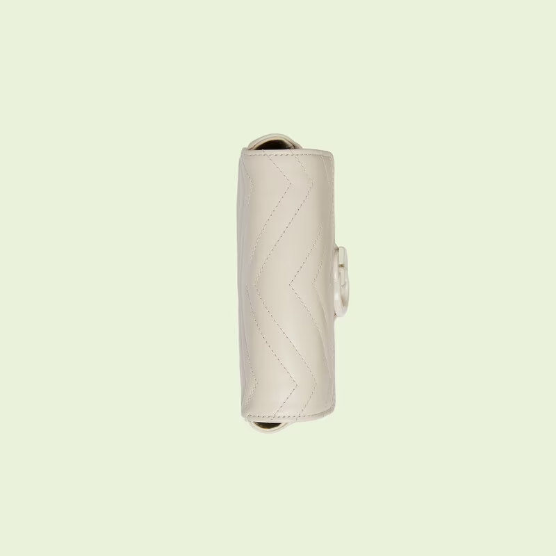 Accessories continue to come to the fore of the Creative Director's collections. A distinctly contemporary accessory. the belt bag is presented in new ways throughout the GG narrative. emphasizing different elements of the versatile style. Here. it is introduced as part of the GG Marmont universe in white chevron matelassé leather with a chain strap.