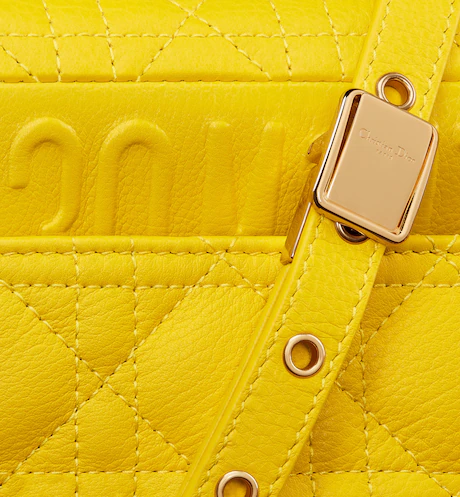 The D Caro bag combines modernity with timeless elegance. The design is crafted in yellow supple calfskin with Cannage stitching. The bag features a flap adorned with an antique gold-finish metal 'CD' twist clasp. inspired by the seal of a Christian D perfume bottle. The detachable chain shoulder strap with 'CD' signature links allows it to be carried by hand. over the shoulder or crossbody. or replaced by one of the House's wide embroidered straps. allowing the small bag to pair with day or evening attire.