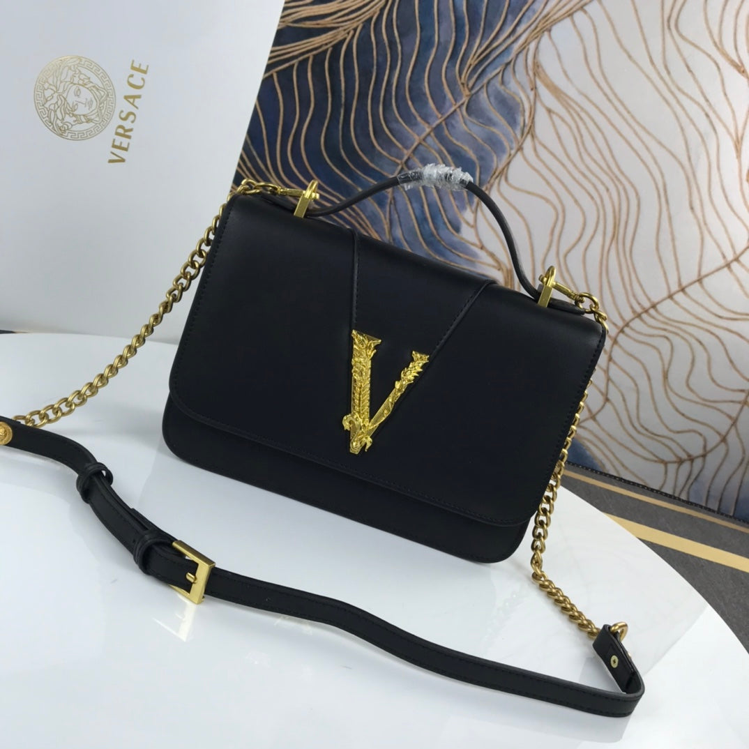 Debuting on the Fall-Winter 2019 runway. the Virtus bag takes its name from the Roman deity and symbolizes strength. courage. and character. Crafted in the finest quality leather. the shoulder bag boasts magnetic flap over closure. a top handle and an adjustable shoulder strap. A bold symbol of the brand's aesthetic heritage. the central gold-tone metal Barocco letter V is embellished by acanthus leaves taken from Ve's signature motif. The inside of the exceptional quality bag features a zipped and flat leather pockets.